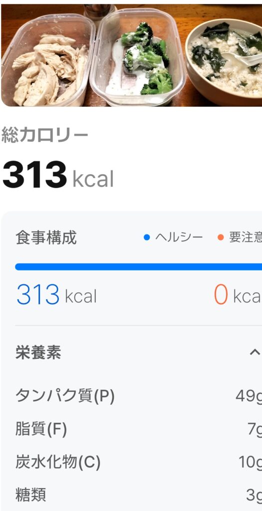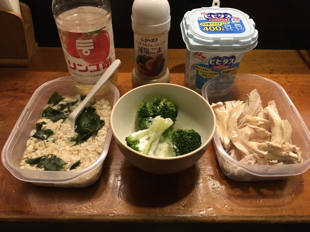 自宅に戻れば、皮なし茹で胸肉、脂肪ゼロヨーグルト、ノンオイルドレッシング、お湯ひたしオートミール、バナナ半分のラカントヨーグ